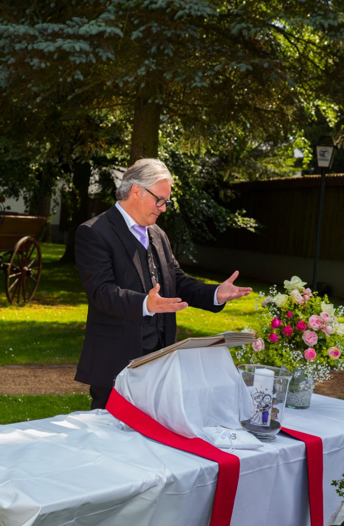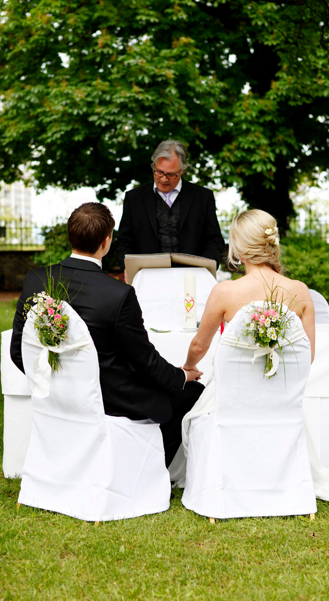 In einem Vorgespräch besprechen wir den äußeren Ablauf und die inhaltliche Gestaltung Ihres schönsten Tages. Sie sollen ihn erleben als Frau und Mann, als gleich- oder intergeschlechtliches Paar am Ort Ihrer Wahl (ob Kirche oder Kapelle, Heißluftballon oder Schiff, im Hotel oder in freier Natur).